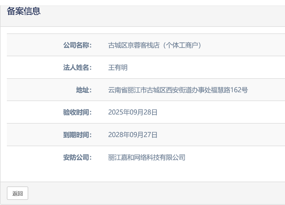 關(guān)于古城區(qū)京蓉客棧店(個(gè)體工商戶(hù))電子監(jiān)控安防合格證下證通知